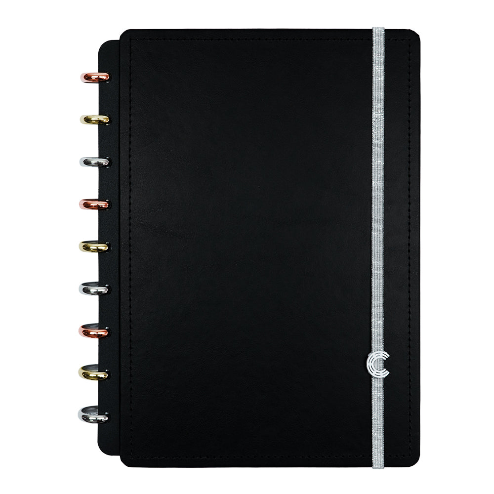 Tamanho Médio. Comporta até 80 folhas de 90g ou 60 folhas de 120g Mude as cores dos discos e do elástico do seu Caderno Inteligente®, deixando-o sempre com cara de novo! ;)