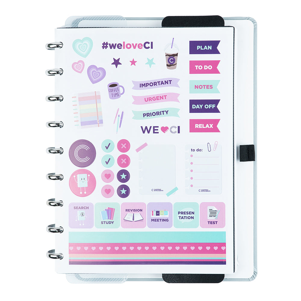Tamanho Médio. Comporta até 80 folhas de 90g ou 60 folhas de 120g Mude as cores dos discos e do elástico do seu Caderno Inteligente®, deixando-o sempre com cara de novo! ;)