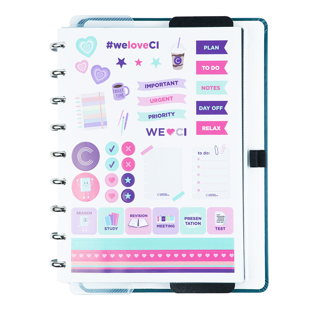 Tamanho Médio. Comporta até 80 folhas de 90g ou 60 folhas de 120g Mude as cores dos discos e do elástico do seu Caderno Inteligente®, deixando-o sempre com cara de novo! ;)