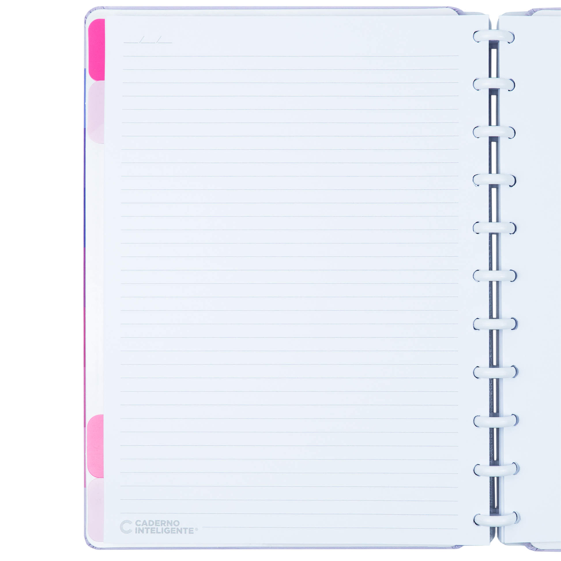 Tamanho Médio. Comporta até 80 folhas de 90g ou 60 folhas de 120g Mude as cores dos discos e do elástico do seu Caderno Inteligente®, deixando-o sempre com cara de novo! ;)