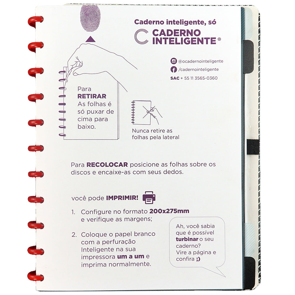 Tamanho Médio. Comporta até 80 folhas de 90g ou 60 folhas de 120g Mude as cores dos discos e do elástico do seu Caderno Inteligente®, deixando-o sempre com cara de novo! ;)