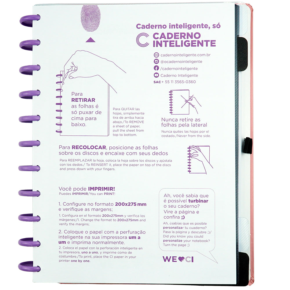 Tamanho Médio. Comporta até 80 folhas de 90g ou 60 folhas de 120g Mude as cores dos discos e do elástico do seu Caderno Inteligente®, deixando-o sempre com cara de novo! ;)