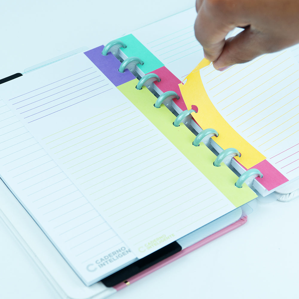 Tamanho Médio. Comporta até 80 folhas de 90g ou 60 folhas de 120g Mude as cores dos discos e do elástico do seu Caderno Inteligente®, deixando-o sempre com cara de novo! ;)