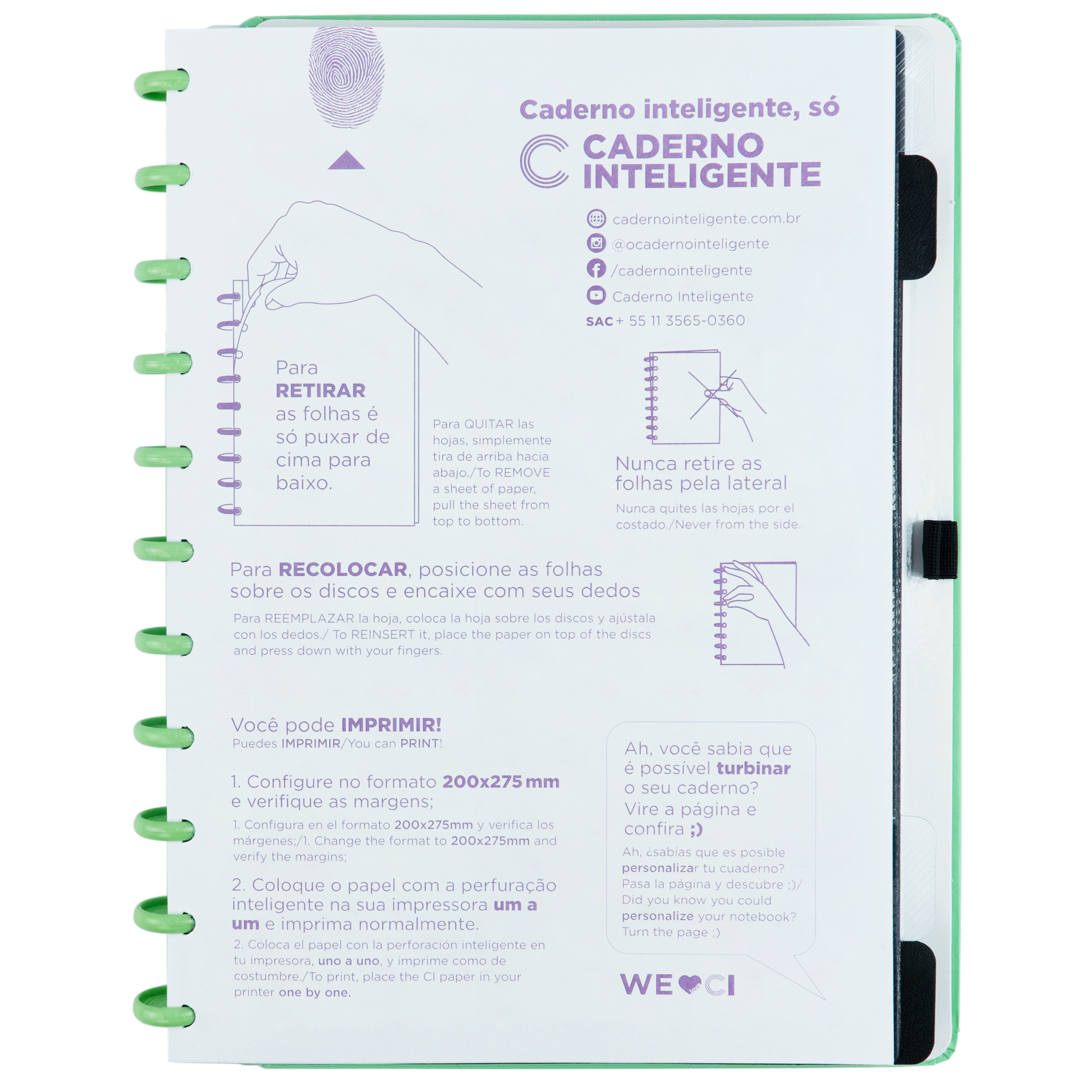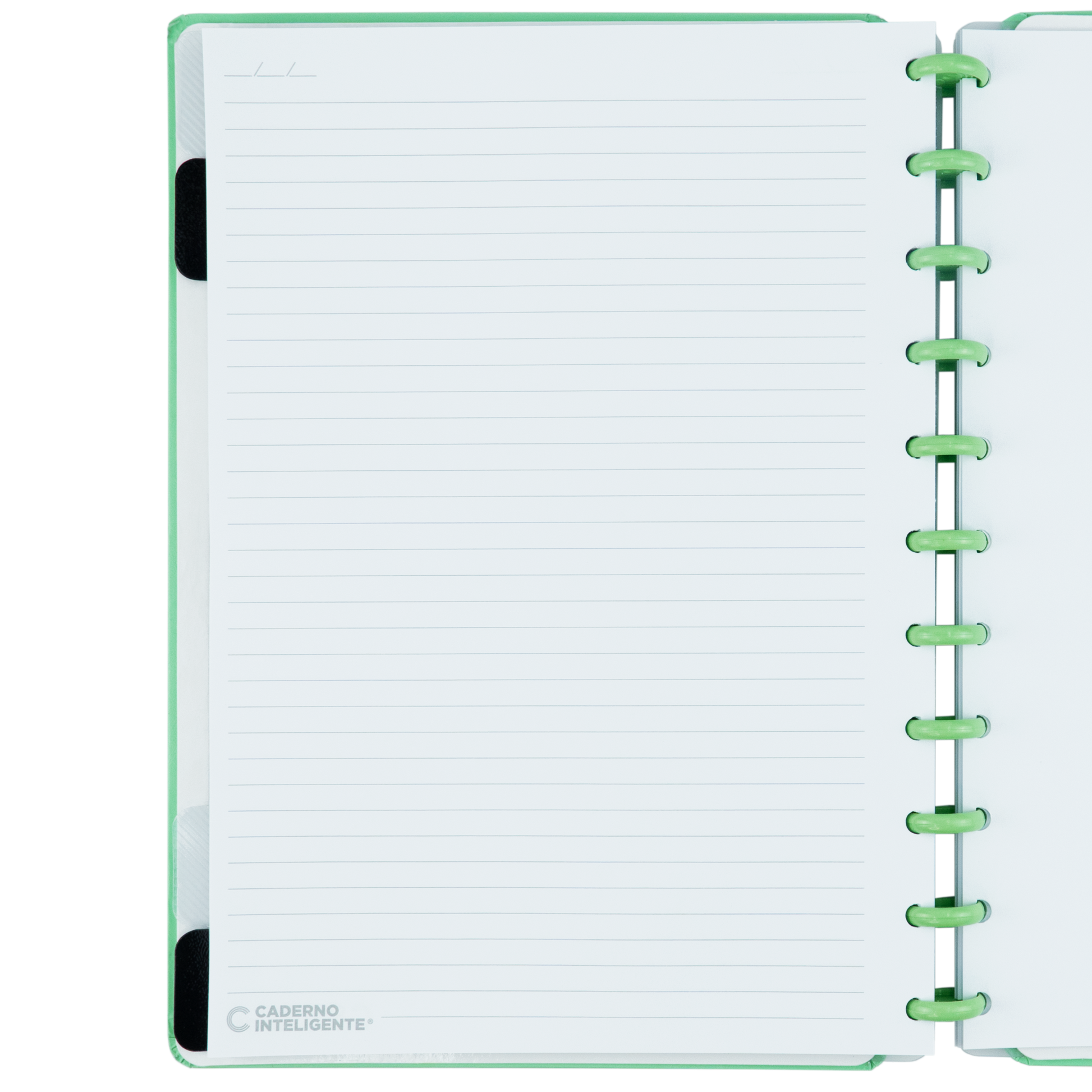 Tamanho Médio. Comporta até 80 folhas de 90g ou 60 folhas de 120g Mude as cores dos discos e do elástico do seu Caderno Inteligente®, deixando-o sempre com cara de novo! ;)